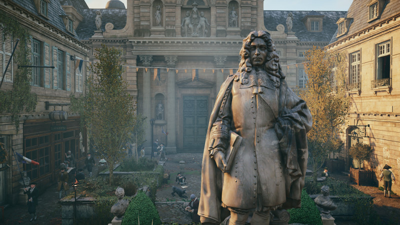 我操纵着游戏,在巴士底狱、凡尔塞宫、塞纳河、巴黎圣母院这些地方奔走,与路易十六、拿破仑、罗伯斯庇尔交谈。有那么一刻,当我在三级会议的会场外面,被皇家士兵拦住,一辆双轮马车擦身而过,扬起一片灰尘。我的头顶突然落下一阵水滴,那是洗衣女工晾塞在二楼窗外的破衣服。我不禁有点恍惚,仿佛身处1789年的巴黎。